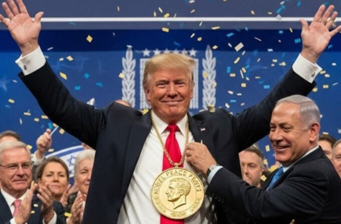 Официјалниот X профил на израелскиот премиер сподели вештачки генерирана фотографија од Бенјамин Нетанјаху како му ја доделува Нобеловата награда за мир на американскиот претседател Доналд Трамп.