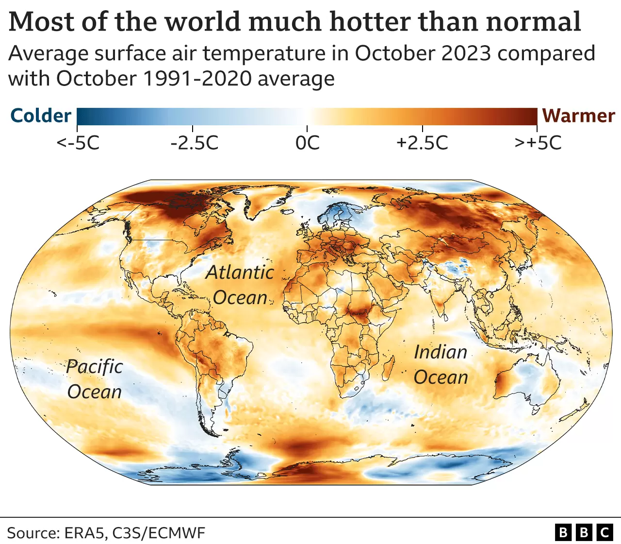 Октомври беше петти последователен месец во кој се забележани рекордни температури. Јули беше толку топол што можеби беше најтоплиот месец во последните 120.000 години, додека просечната септемвриска температура го собори претходниот рекорд за „неверојатни“ 0,5 степени Целзиусови, според Коперник.