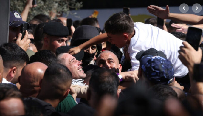 Некои покажуваа знаци на победа со рацете, а повеќето со насмевки на лицата излегоа од автобусот што ги однесе од израелски затвор до културниот центар во градот каде што е седиштето на Палестинската самоуправа.