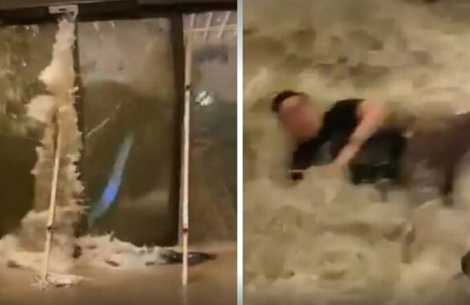 Текстот (Видео) Страшни снимки од тајфунот во Хонг Конг: Водата навлезе во хотел, пукаа стаклените врати е превземен од МАКФАКС.
