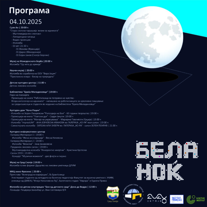 Универзална сала и Град Скопје ја најавуваат 21-та изведба на културната манифестација „Бела ноќ“, која ќе се одржи на 04 октомври 2025 година (сабота).