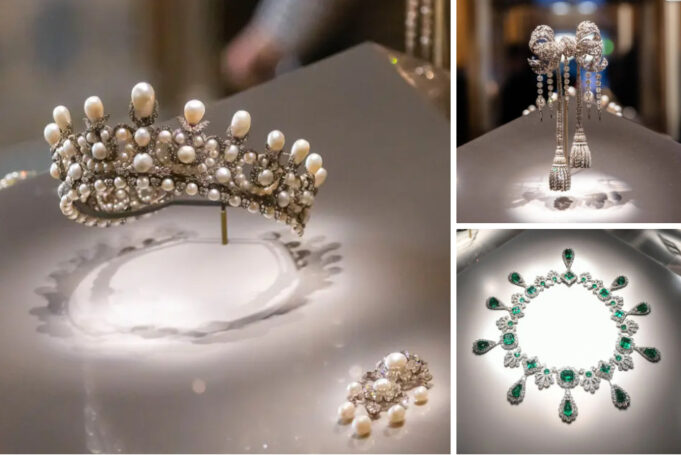 Од колекцијата на царицата Евгенија, сопруга на Наполеон III: два броша (од кои едниот е реликвијар), декоративен јазол за корсет и тиара.
