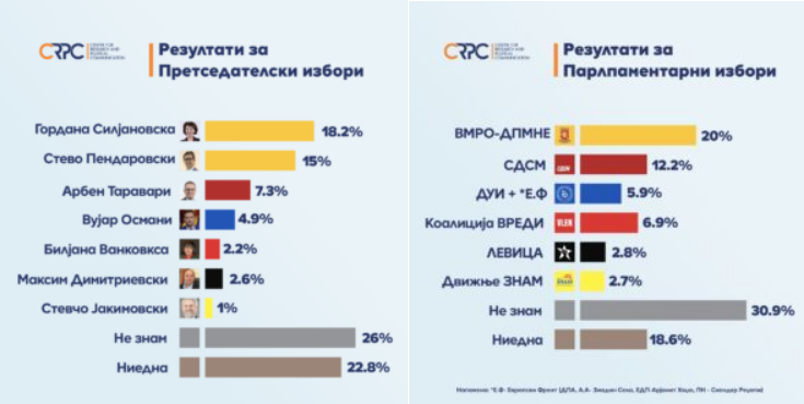 Според анкетата спроведена од Центарот за политички Истражувања и Комуникации (CRPC), во соработка со Здружението за новинарство, информирање, комуникации и маркетинг услуги „Глас на вистината”, најголем број на испитаници се изјасниле дека на претстојните претседателски и парламентарни избори, би гласале за ВМРО-ДПМНЕ и за Гордана Силјановска Давкова.