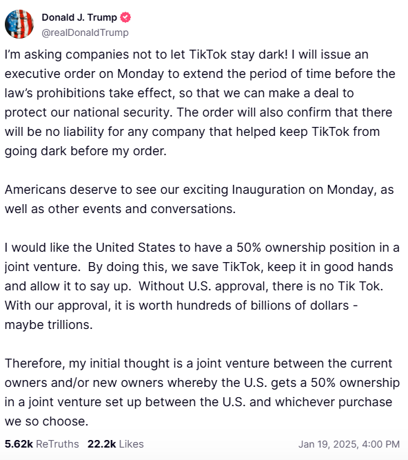 Новоизбраниот претседател Доналд Трамп изјави дека утре, на неговиот прв ден на функцијата, ќе потпише извршна наредба со која ќе му се овозможи на „Тик-ток“ привремено да продолжи да работи во САД, истовремено сугерирајќи дека американската влада би можела да преземе делумна сопственост на социјалната мрежа.