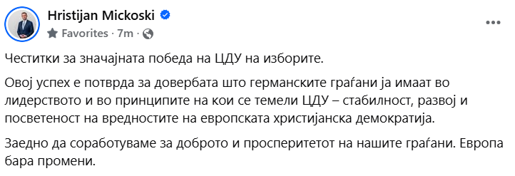 Премиерот Христијан Мицкоски ја честиташе победата на ЦДУ на изборите во Германија преку социјалните мрежи.