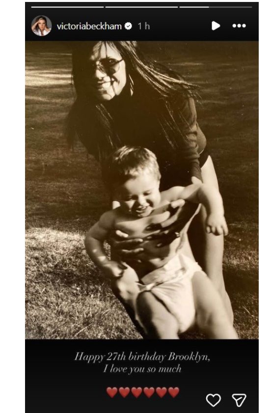Неколку минути подоцна, Викторија ја сподели истата фотографија со пораката: „Среќен роденден, Бруклин, те сакаме толку многу“. Потоа таа објави фотографија на која се смее со својот син, придружена со серија емотикони во облик на срце.