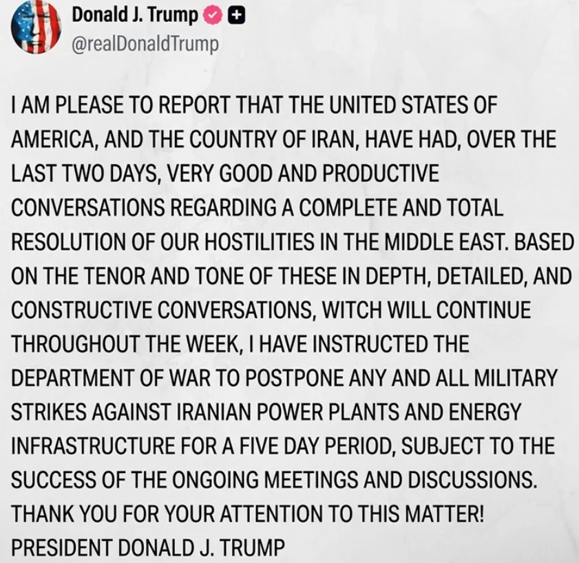 Врз основа на природата и тонот на овие детални, сеопфатни и конструктивни дискусии, кои ќе продолжат во текот на неделата, му наредив на министерството за одбрана да ги одложи сите воени напади врз иранските енергетски објекти и енергетска инфраструктура за пет дена, во зависност од успехот на тековните состаноци и дискусии“, напиша Трамп на Truth Social.