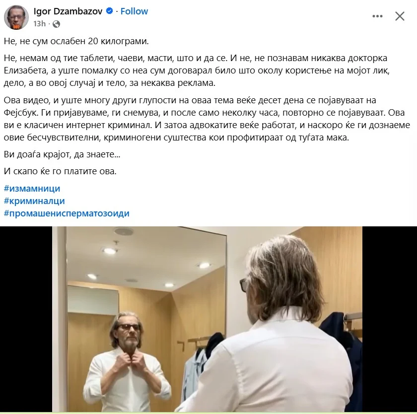 „Не, не сум ослабен 20 килограми. Не, немам од тие таблети, чаеви, масти, што и да се. И не, не познавам никаква докторка Елизабета, а уште помалку со неа сум договарал било што околу користење на мојот лик, дело, а во овој случај и тело, за некаква реклама.