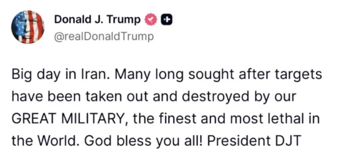 Американскиот претседател Доналд Трамп објави на социјалната мрежа Truth Social дека американските сили извршиле успешни напади врз повеќе цели во Иран.