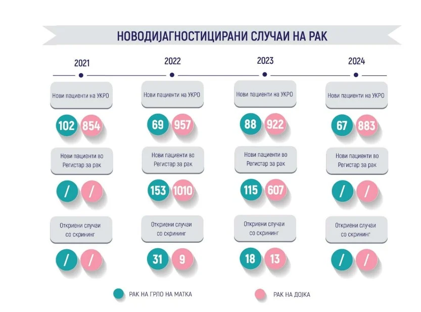 „Скрининг програмите се реализираат континуирано, но опфатот на целната популација е ограничен и не обезбедува значајни популациски ефекти. Анализата покажува дека опфатот на скринингот на рак на дојка се движи од 0,8% до 5,4%, додека кај скринингот на рак на грло на матка од 10,3% до 15,5% од целната популација, што е значително под европските препорачани нивоа за организиран популациски скрининг. Овие податоци упатуваат дека со постојниот опфат не може да се очекува доволен ефект во раното откривање на болеста“, се наведува во извештајот.