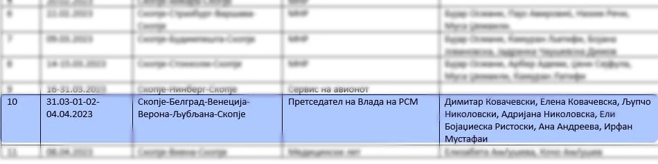 Мини турнејата траела пет дена. Прво одлетале до Белград кога владината прес служба извести дека Ковачевски е во официјална посета на Србија. Потоа продолжиле во Венеција, посета за која нема известувања. Два дена подоцна слетале во Верона на саем на вино, а пред да се вратат во Скопје биле и во Љубљана. Владината прес-служба извести за активностите на премиерот во Белград и Верона и за министерот во Верона, но не кажа ниту збор дека со нив биле и сопругите.