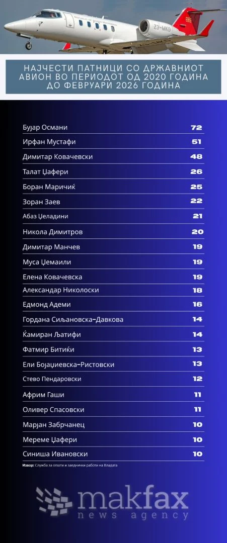 Листата на патници во државниот авион од последните пет години покажува дека функционерите не го избегнувале туку во него се качувале и со децата и со сопругите, оделе на подолги патувања со преседнувања, а се случувало да одат и на мини турнеи. По жестоките обвинувања меѓу ВМРО-ДПМНЕ и СДСМ околу тоа кој се луксузирал, а кој го избегнувал државниот авион пред месец и пол, „Макфакс“ побара детална листа на патници од Службата за општи и заеднички работи во Владата која има обврска да ги бележи сите летови и сите патници во авионот. Со објаснување дека се работи за многу долг период оти авионот е во употреба од 2005 година, а во дигитална форма ги имаат само податоците од 2020 година навака,  Службата побара дополнителен рок за подготовка на извештајот за патниците и летовите. По истекот и на дополнителниот рок испрати листа на патници само за последните пет години со образложение дека законски се обврзани само толку да ги чуваат податоците.