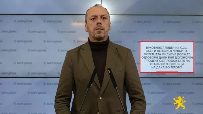 Врховниот лидер на СДС, Заев и неговиот чувар на фотелјата Филипче должат одговори дали бил договорен процент од продажбата на станбените единици на „Дака“ во Тетово, рече денес на прес-конференција пратеникот Бране Петрушевски.