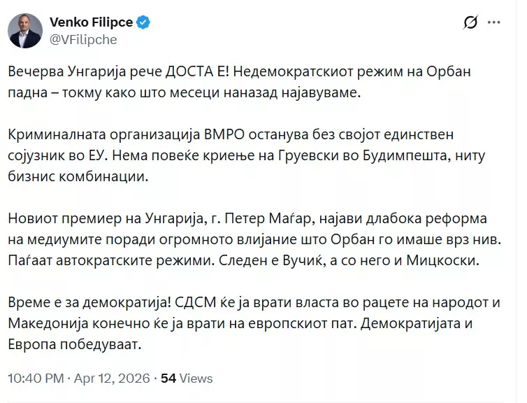 Криминалната организација ВМРО останува без својот единствен сојузник во ЕУ. Нема повеќе криење на Груевски во Будимпешта, ниту бизнис комбинации. Новиот премиер на Унгарија, г. Петер Маѓар, најави длабока реформа на медиумите поради огромното влијание што Орбан го имаше врз нив. Паѓаат автократските режими. Следен е Вучиќ а со него и Мицкоски. Време е за демократија! СДСМ ќе ја врати власта во рацете на народот и Македонија конечно ќе ја врати на европскиот пат. Демократијата и Европа победуваат.“, пишува Филипче.
