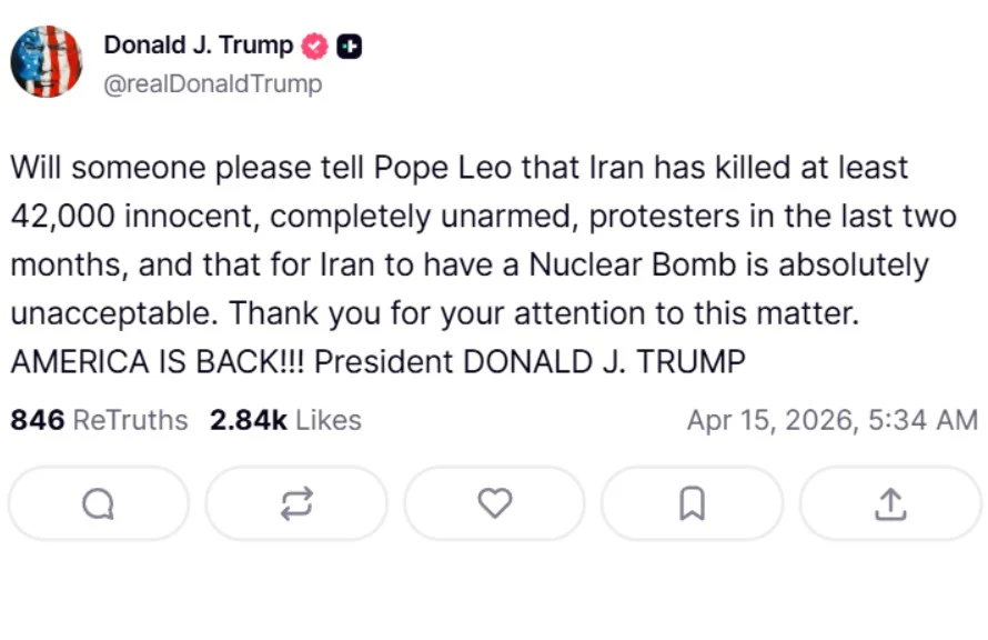 Во една од објавите, тој побара од некого „ве молам да му кажете на Папата Лав… дека е апсолутно неприфатливо Иран да има нуклеарна бомба“.