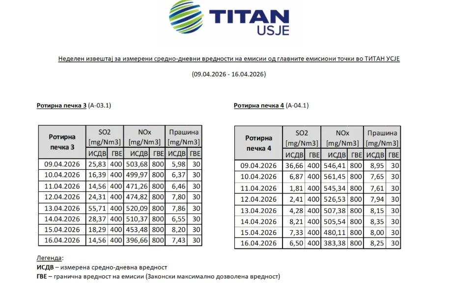 Компанијата „Титан Усје“ соопшти дека емисиите од нејзиното работење постојано се под граничните вредности утврдени со закон.
