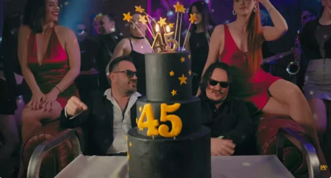 На музичката торта за „Дента кога наполнив 45“ како јаготка на шлагот доаѓа видеоспотот во кој освен прилично убедливиот актерски талент на Пере и Брејк сиот свој потенцијал го покажува и женскиот дел на екипата. Неа и овој пат ја сочинуваат атрактивни убавици, манекенки и модели кои со своите раскошни телесни убавини совршено се вклопуваат во музичко-филмската приказна за „кризата на средните години“ што го мачи сиот машки свет во неговиот животен век, за која пеат Пере и Брејк во – „Дента кога наполнив 45“.