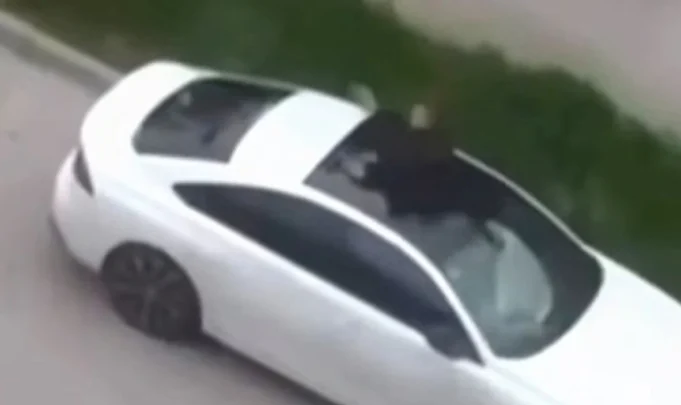 На видеото се гледа како мажот со палка удира по возилото, а потоа се качува врз него. Откако извесно време скокал по покривот, тој пропаднал во внатрешноста на автомобилот, јавуваат регионалните медиуми.