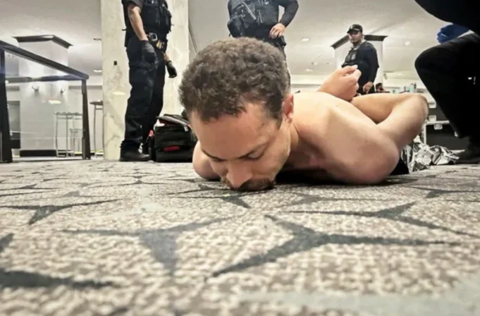 На фотографијата се гледа маж без маица како лежи со лицето надолу на тепих, со рацете врзани со лисици зад грб, а тројца обезбедувачи стојат зад него.