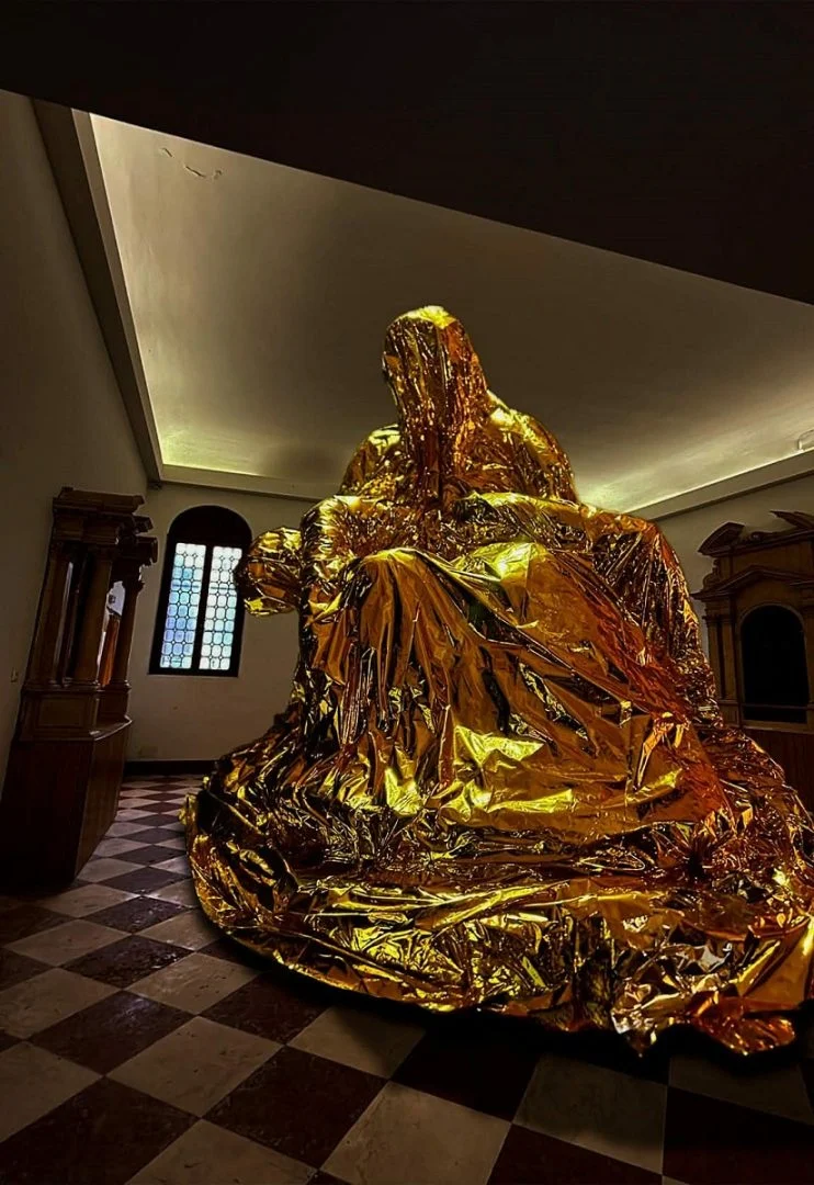 Тој во своето монументално дело ја обвиткува препознатливата Пиета со златни ургентни прекривки, изработени од метализиран пластичен филм (мајлар-повеќеслојна тенка рефлектирачка фолија, обложен со алуминиум), материјал првенствено произведен за вселенски мисии. Тие се водоотпорни, рефлективни и ја задржуваат телесната топлина. Но, во овој случај, служи за авторот повторно да ја облече Пиетата за да создаде нови значења.