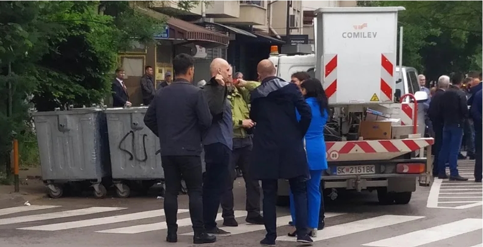 Контејнерите во близина на спомен обележјето каде што руската амбасада одржа церемонија. На фотографијата се гледаат и пропадници на Левица (фото: ЦИВИЛ)