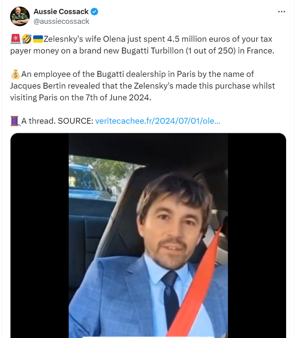Проруските сметки на англиски и француски јазик на платформата за социјалните медиуми Х, како и на каналите на Телеграм, активно шират информации во кои се тврди дека првата дама на Украина Олена Зеленска купила нов хиперавтомобил Bugatti Tourbillon за 4,5 милиони евра за време на нејзината посета на Франција. на почетокот на јуни 2024.