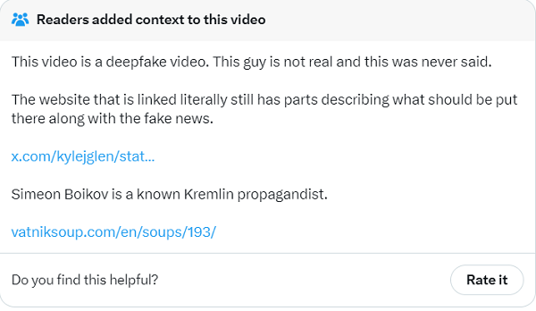 Веста која беше молскавично преземена и споделена од проруските сметки на Х, беше дебанкирана како лажна со користење на дип фејк видео. а ликот во видеото не е вистински и ова никогаш не било кажано.