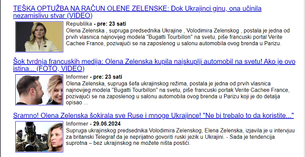 По него следат други српски медиуми , кои при пренесувањето на лажната вест како да се натпреваруваат кој ќе измисли подегутантен наслов: ТЕШКО ОБВИНУВАЊЕ НА ОЛЕНА ЗЕЛЕНСКА: Додека Украинците умираат, таа го направи незамисливото; Шок тврдење на француските медиуми: Олена Зеленска го купи најскапиот автомобил на светот! Ако е ова вистина… ; Срамно! Олена Зеленска ги шокираше сите Руси и многу Украинци! „Не треба да го користите тоа…“