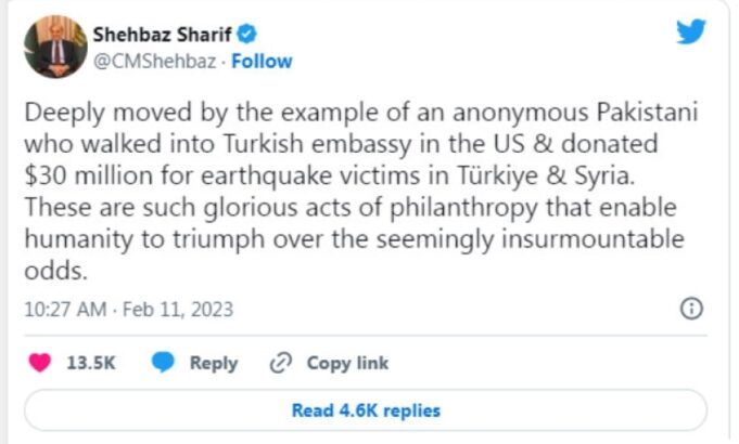 „Длабоко трогнат од примерот на анонимен Пакистанец кој влезе во турската амбасада во САД и донираше 30 милиони долари за жртвите од земјотресот во Турција и Сирија“, напиша пакистанскиот премиер на Твитер.
