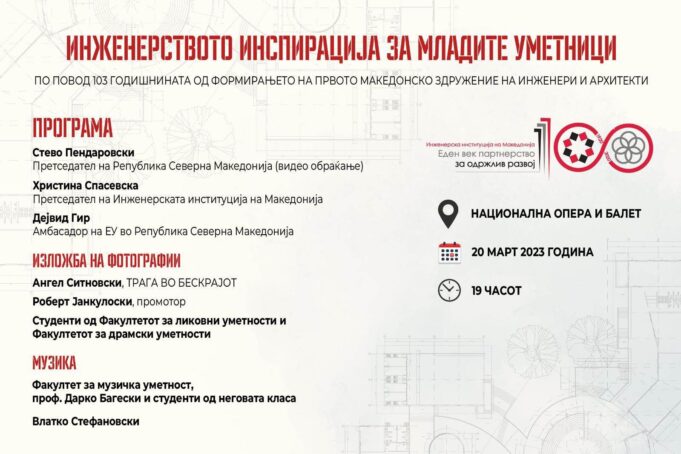 Асоцијацијата на здруженија на инженери – Инженерска институција на Македонија одбележува 103 годишнина од формирањето на првото македонско здружение на инженери и архитекти,. По тој повод организира настан „Инженерството инспирација за младите уметници“.