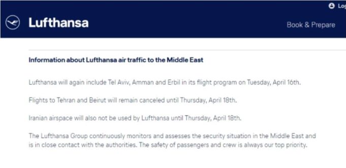 Германската авиокомпанија Луфтханза ги прекина своите редовни летови до и од Тел Авив, Ербил и Аман, до и вклучително денеска. Летовите кон Бејрут и Техеран ќе останат суспендирани најмалку до четврток.
