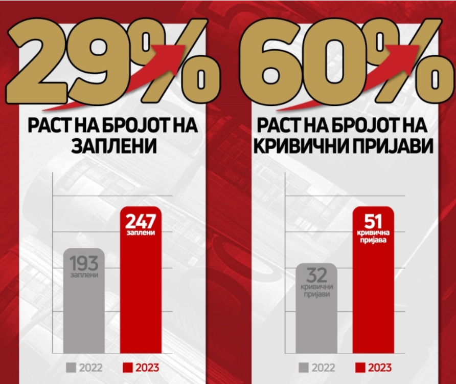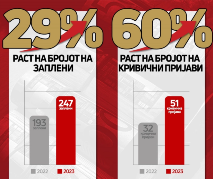– Еден од главните приоритети е нула толеранција кон шверцот и организираниот криминал. Видливите резултати во овој дел значат просперитет и значат побрз влез во ЕУ, а резултати веќе има – заплените во 2023 се зголемени за точно 29 проценти, а поднесените кривични пријави за 60 проценти, вели директорот на Царинска управа, Стефан Богоев, стои во соопштението.