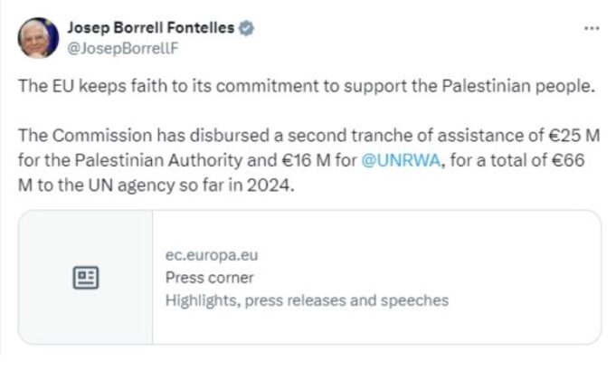 Борел на Х напиша дека 25 милиони евра од таа сума се наменети за палестинската управа, а 16 милиони евра за Агенцијата на Обединетите нации за помош и работа за палестинските бегалци (УНВА).