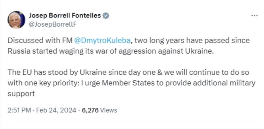 Slava Ukraini! pic.twitter.com/zGJts0FlCX— Josep Borrell Fontelles (@JosepBorrellF) February 24, 2024