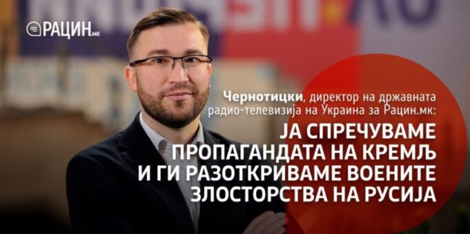 Во ова ексклузивно интервју за порталот Рацин.мк, првиот човек на Јавниот радиодифузен сервис на Украина (Національна суспільна телерадіокомпанія України, или скратено Суспільне України) Миколај Чернотицки говори за работата на новинарите и медиумските работници на државната телевизија во услови на војна, за борбата за спречување на дезинформациите на Русија и за откривањето на воените злосторства на руските воени формации.