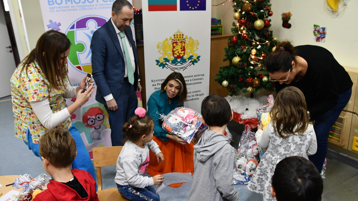 Амбасадорот на Бугарија во Северна Македонија Ангел Ангелов, неговата сопруга Билјана Ангелова, директорката на Бугарскиот културно-информативен центар во Скопје Антонија Велева и претставници на амбасадата ги воодушевија децата со пакетчиња со подароци и играчки и добија благодарници во име на Здружението. за поддршка и третман на лица од аутистичен спектар и атипичен развој „Во мојот свет“ што го води центарот.