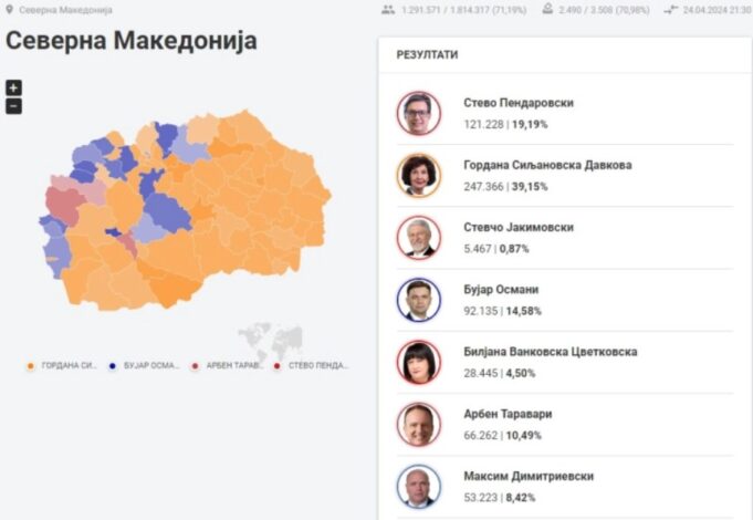 Првичните резултати што Државната изборна комисија ги објавува на својата веб-страница покажуваат дека од обработени 71,19 проценти од гласовите, односно 2 490 од вкупно 3 508 избирачки места, води кандидаткта на ВМРО-ДПМНЕ Гордана Силјановска Давкова со освоени 247 366 гласови (39,15%), пред Стево Пендаровски од СДСМ со 121 228 гласови (19,19%).