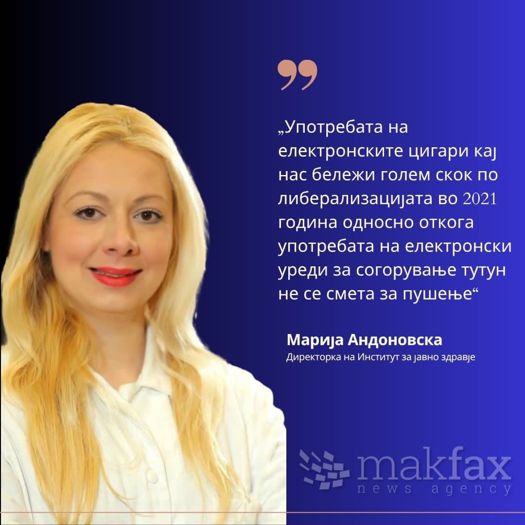 „Ние како Институт даваме препораки за заштита од пушење, кои се во интерес на јавното здравје онолку колку што ни дозволува законската рамка. Засега нема законска забрана за употреба на ароматични електронски цигари, но тоа не ја исклучува можноста да работиме и на иницијатива со која ќе се забранат. Употребата на електронските цигари кај нас бележи голем скок по либерализацијата на нивната употреба во 2021 година, односно откога употребата на електронски уреди за согорување тутун не се смета за пушење и тие не подлежат на забраните од Законот за заштита од пушењето“, вели директорката Андоновска за „Макфакс“.