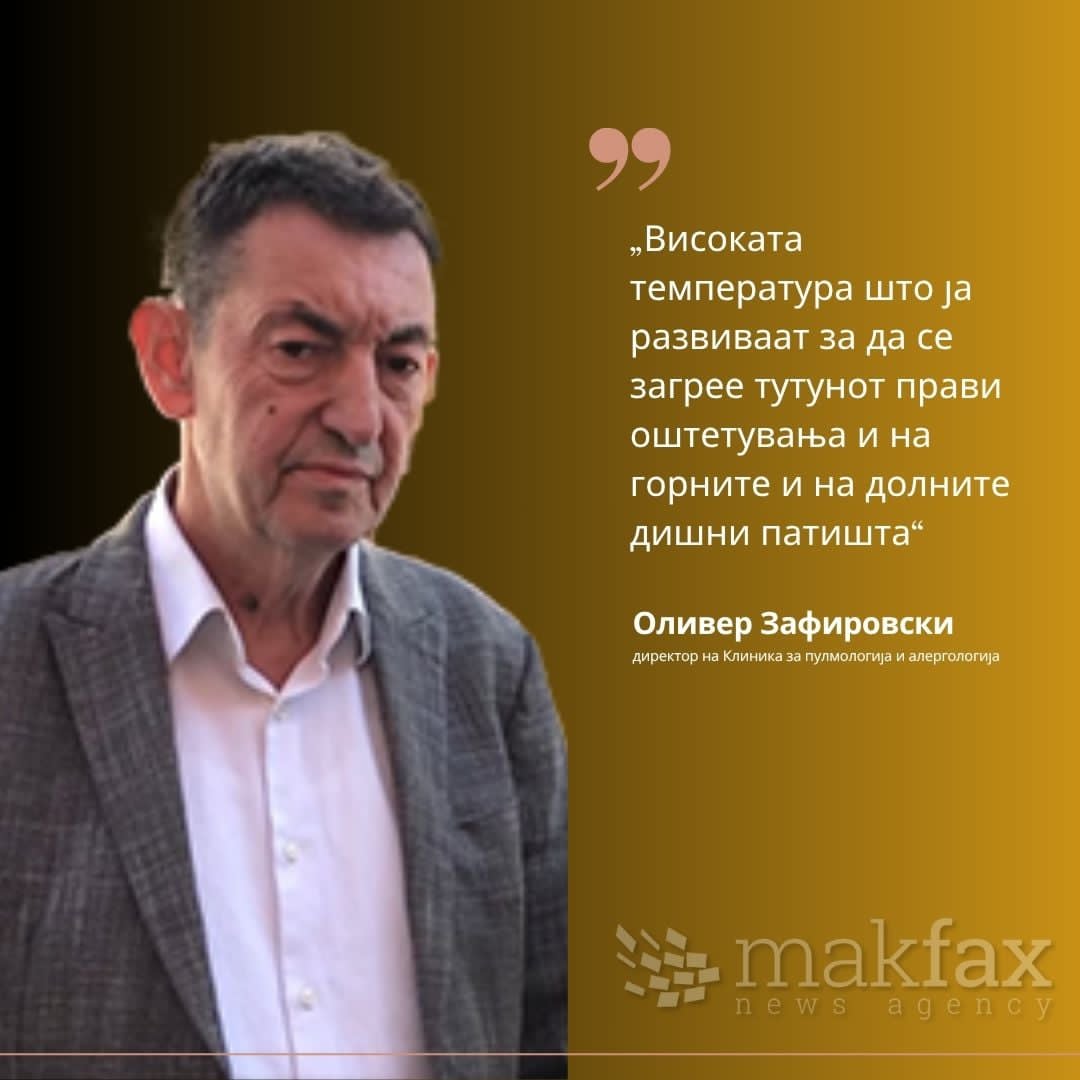 „Страшно е што кај нас и лекарите не може да влијаат оти и голем број од нив ги употребуваат овие цигари, па се случува – како вие ми кажувате дека се штетни, а самиот ги употребувате? Ние на Клиниката имаме посебен тим со психолог, кој помага за одвикнување од цигари. Има понекој што доаѓа, обично тоа се наши пациенти, но нема континуитет. Доаѓаат два-трипати и се откажуваат. Наши пациенти, кои имаат ХОБС или астма, знаеме дека употребуваат електронски цигари, но кога ќе ги прашаме, не признаваат. Мислат дека се помалку штетни, а ние како лекари немаме дилеми дека се штетни. Електронските цигари и уредите за згревање тутун, каков и да им е називот, се многу штетни. Високата температура што ја развиваат за да се загрее тутунот прави оштетувања и на горните и на долните дишни патишта. Ја оштетуваат слузницата и на трахејата и на белите дробови“, објасни директорот Зафировски.