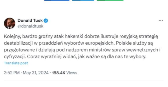 Хакерскиот напад врз полската новинска агенција (ПАП) сведочи за намерата на Русија да ја дестабилизира ситуацијата во Полска пред изборите за Европскиот парламент, изјави денеска полскиот премиер Доналд Туск.