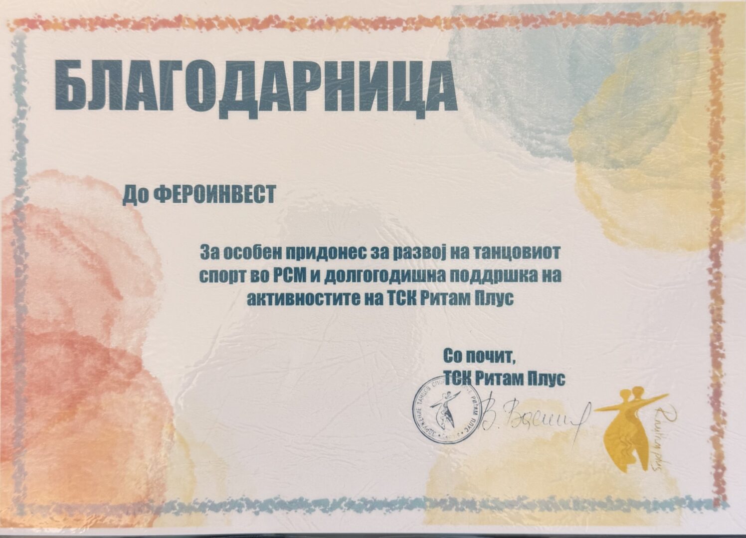 Фероинвест беше спонзор на престижниот интернационален натпревар во латиноамерикански и стандардни танци, кој викендов се одржа во Скопје под покровителство на Светската федерација за спортски танц (World DanceSport Federation – WDSF).