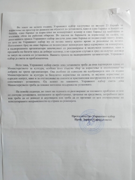 За да биде доследно до крај новинарската постапка, Рацин.мк се јави и се допишуваше со Претседателката на УО на Филхармонија Зорица Каракутовска, и таа не извести дека за овој настан, во организација на ВМРО-ДПМНЕ, до УО на установата „барање за ваков настан не е пристигнато“.