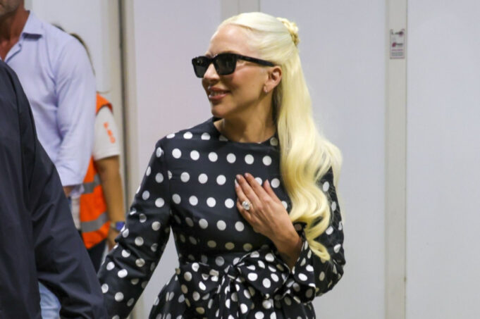 Популарната пејачка, која неодамна призна дека доживеала нервен слом додека го снимала филмот „A Star Is Born“, за вечерна прошетка носеше пастелно зелен свилен костум, под кој се гледаше црн градник.