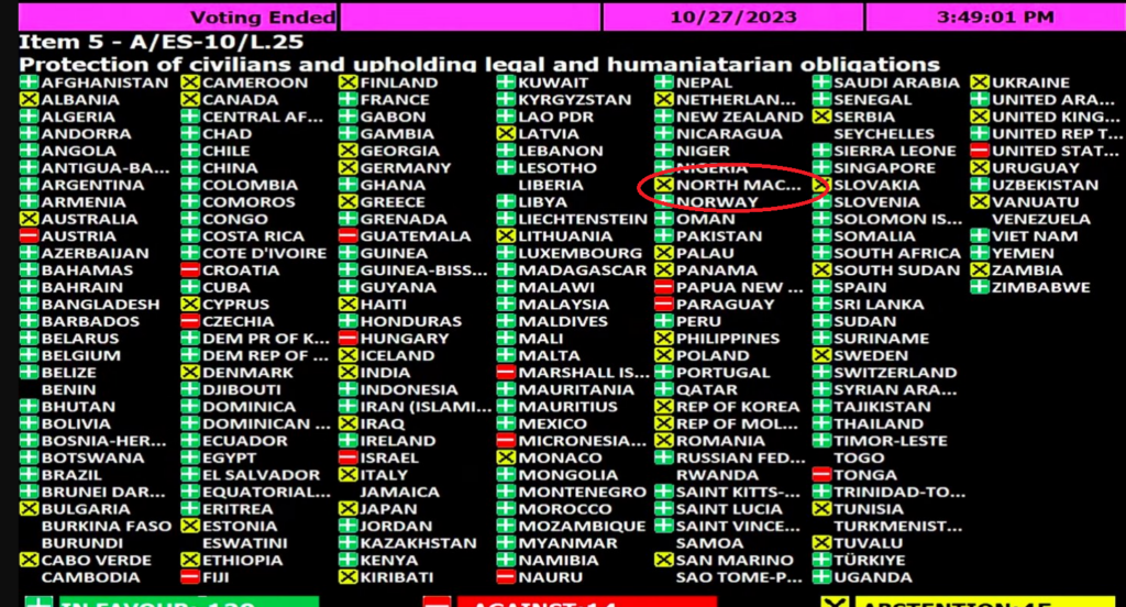 Резолуцијата на Генералното собрание на ОН која беше поднесена од Јордан, беше донесена со 120 гласа „за“, 45 држави беа воздржани меѓу нив и Северна Македонија, а 14 гласаа против, вклучувајќи ги Израел и САД, а од Европа Австрија, Чешка, Хрватска и Унгарија.