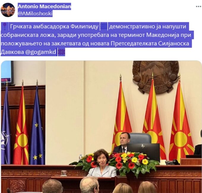 Грчката амбасадорка Софија Филипиду, која ја следеше седницата на Собранието за инаугурација на Гордана Силјановска-Давкова за претседателка на државата, ја напушти пленарната сала, во знак на протест поради тоа што Силјановска-Давкова, при давањето свечена заклетва, не го употреби уставното име на земјава – Република Северна Македонија, туку користеше Македонија.