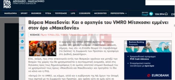 Во текстот под наслов „Северна Македонија: И лидерот на ВМРО инсистира на терминот „Македонија“; АНА-МПА ја пренесува изјавата на Мицкоски и ставот дека „ако Грција смета дека го прекршуваме Договорот од Преспа нека се обрати до Меѓународниот суд“.