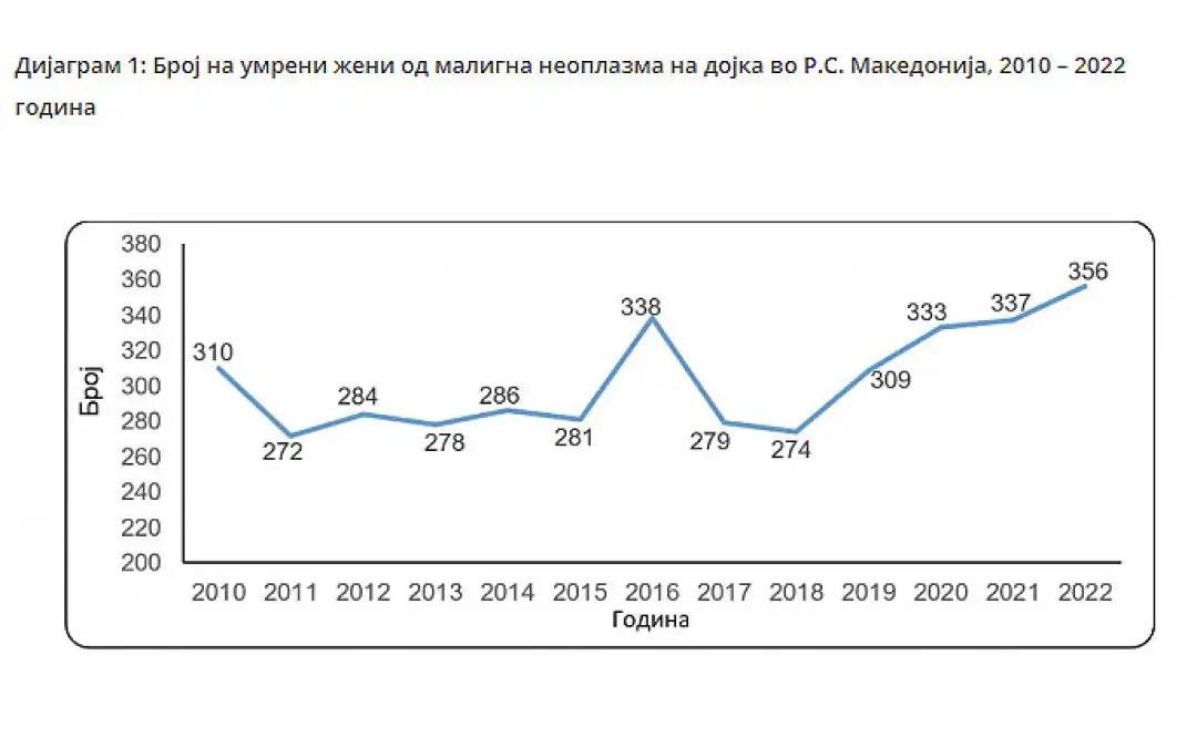 Од малигна неоплазма на дојка во 2010 година починале 310 жени со стапката на морталитет од 30,0/100000 жени, во 2021 година 337 жени со стапка од 32,6 и во 2022 година 356 жени со стапка од 38,5 на 100000 жени, се посочува во информацијата од ИЈЗ објавена на нивната веб-страна.