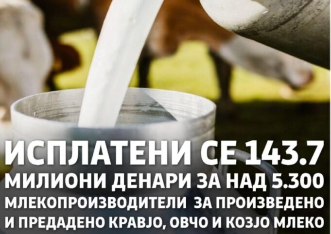 Платежната агенција им исплати 143,7 милиони денари на над 5 300 млекопроизводители за произведено и предадено кравјо, овчо и козјо млеко, соопшти Министерството за земјоделство, шумарство и водостопанство (МЗШВ).