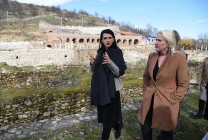 Министерката за култура Бисера Костадиновска Стојчевска и амбасадорката на САД во нашата држава, Анџела Агелер денеска остварија средба во Хераклеја во Битола, каде беше претставен проектот за конзервација и презентација на мозаиците и архитектурата на локалитетот.