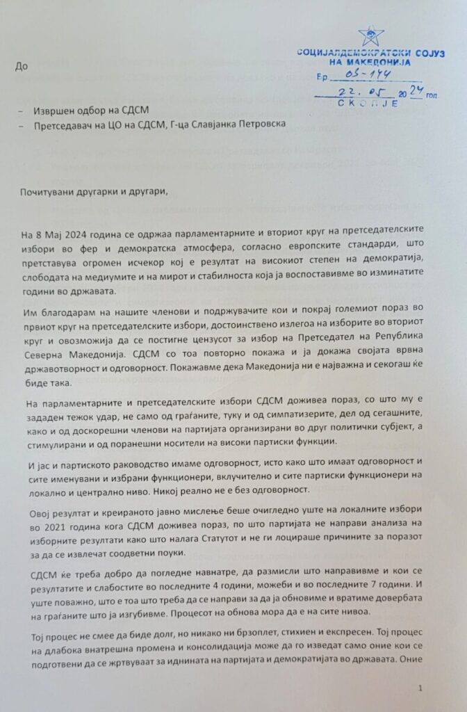 „СДСМ ќе треба добро да погледне навнатре, да размисли што направивме и кои се резултатите и слабостите во последните четири години, можеби и во последните седум години“, додава Ковачевски во писмотот.